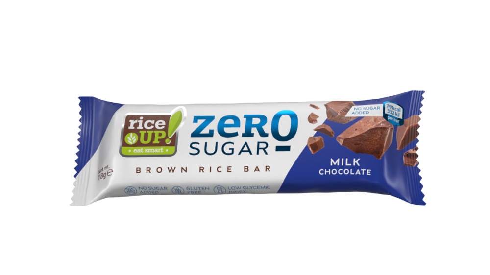 Rice Up Zero Sugar gluténmentes, tejcsokoládés teljes kiőrlésű barna rizsszelet hozzáadott cukor nélkül.